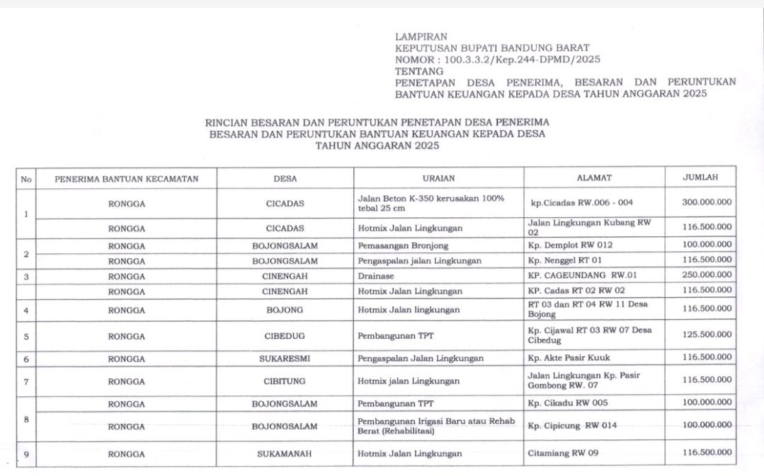 Proyek infrastruktur ini didanai melalui mekanisme Bantuan Keuangan Kabupaten (PBK) T.A 2025. Berdasarkan lampiran Keputusan Bupati Bandung Barat Nomor: 100.3.3.2/Kep.244-DPMD/2025 tentang Calon Penerima dan Calon Lokasi (CPCL), total anggaran yang dialokasikan untuk pekerjaan ini adalah sebesar Rp116.500.000.