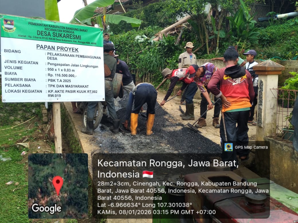 SUKARESMI-RONGGA, BANDUNG BARAT – Pemerintah Desa Sukaresmi, Kecamatan Rongga, telah selesai merealisasikan proyek pengaspalan jalan lingkungan yang berlokasi di Kampung Akte Pasir Kuuk, RW 019. Langkah ini diambil sebagai upaya nyata dalam meningkatkan aksesibilitas dan mobilitas ekonomi masyarakat setempat.